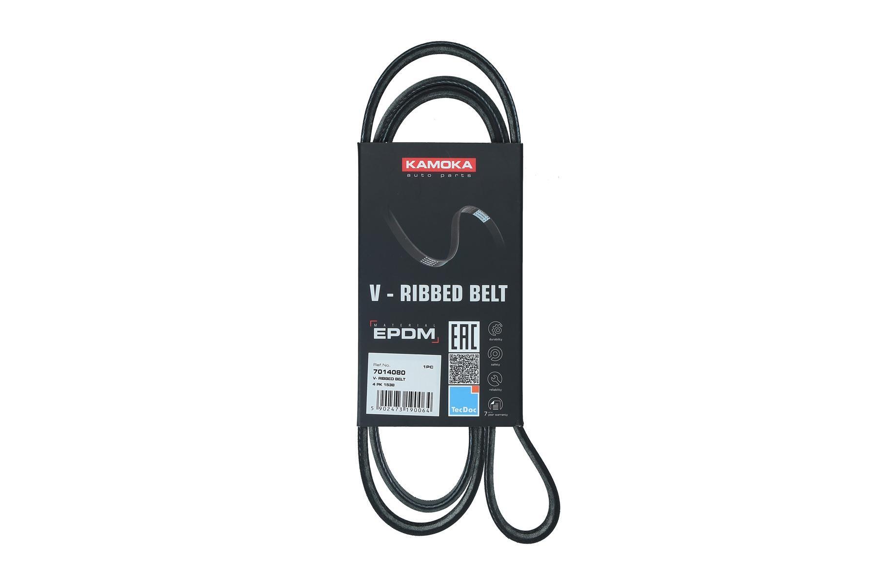 Curea transmisie cu caneluri KAMOKA 7014080; Agregate angrenate: Compresor de climatizare; An fabricatie de la: 200906; An fabricatie pana la: 201306; Lungime [mm]: 1538; Material: EPDM (etilen propilen dienă cauciuc); Numar motor TECDOC: 23529; Numar nervuri: 4