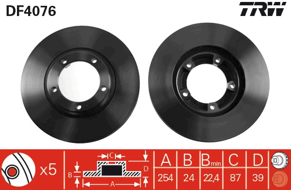 Partea de montare: punte fataTip disc frâna: ventilatDiametru exterior [mm]: 254Grosime disc frâna [mm]: 24Grosime minima [mm]: 22,4Diametru de centrare [mm]: 87Înaltime [mm]: 39Numar gauri: 5Dimensiune filet: 10,6Asezare gauri Ø [mm]: 108