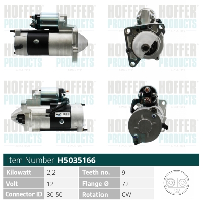 Tensiune [V]: 12Putere electromotor [kW]: 2,2 ->Diametru flanÈ™ă [mm]: 72Identificare constructie stecher: 30-50Numar dinti: 9Numarul gaurilor de fixare: 2Directia de rotatie: rotatie contrar acelor de ceasornic