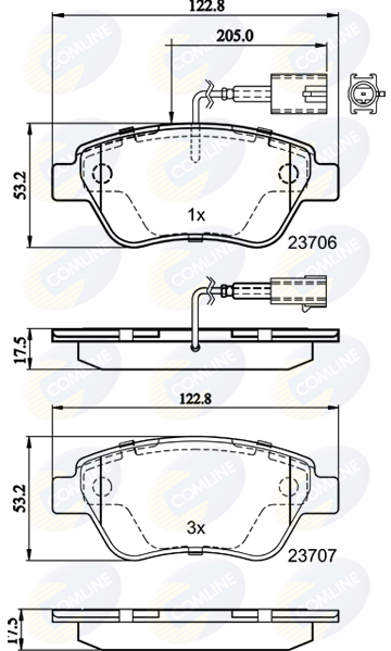 Partea de montare: punte fata ->Grosime [mm]: 17,5 ->Lungime [mm]: 122,8 ->Latime [mm]: 53,2Numărul indicatorilor de uzură [per axă]: 1Contact indicator uzura: cu contact integrat avertizare uzuraPlacuta de frana: cu muchie tesitaSistem de frânare: BoschNumar WVA: 23706, 23707