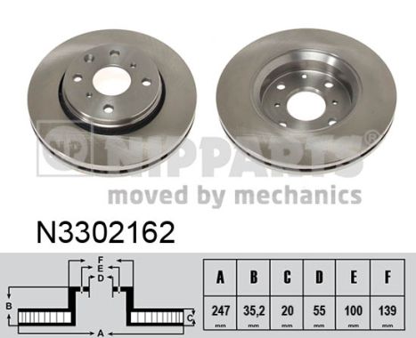 Partea de montare: punte fataTip disc frâna: ventilat interiorGrosime disc frâna [mm]: 20Diametru exterior [mm]: 247Înaltime [mm]: 35,2Numar gauri: 4Diametru de centrare [mm]: 55Asezare gauri Ø [mm]: 100Diametru butuc roata [mm]: 139Grosime minima [mm]: 18