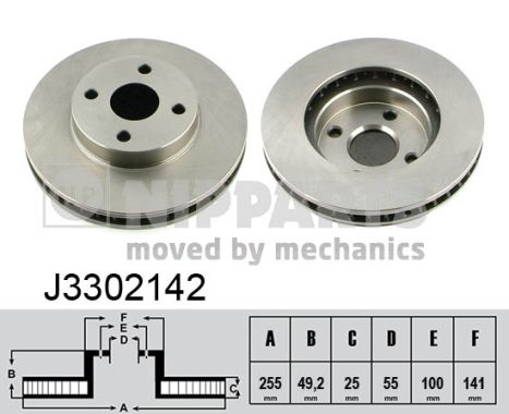 Tara productie vehicul: JaponiaPartea de montare: punte fataTip disc frâna: ventilat interiorGrosime disc frâna [mm]: 25Diametru exterior [mm]: 255Înaltime [mm]: 49,2Numar gauri: 4Diametru de centrare [mm]: 55Asezare gauri Ø [mm]: 100Diametru butuc roata [mm]: 141Grosime minima [mm]: 23