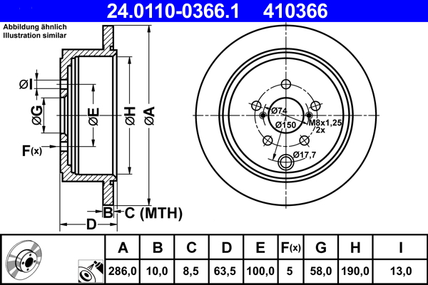 Variantă de echipare: BasePartea de montare: puntea spateDiametru exterior [mm]: 286,0Grosime disc frâna [mm]: 10,0Grosime minima [mm]: 8,5Tip disc frâna: plinSuprafata: acoperit (cu un strat protector)Numar gauri: 5Asezare gauri Ø [mm]: 100,0Înaltime [mm]: 63,5Diametru de centrare [mm]: 58,0Diametru interior [mm]: 190,0Diametrul orificiului [mm]: 13,0Cod MAPP disponibilAprobare: E1 90R-02C0248/0976