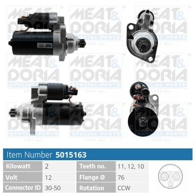 Tensiune [V]: 12Putere electromotor [kW]: 2Diametru flanșă [mm]: 76Identificare constructie stecher: 30-50Numar dinti: 11, 12, 10Numarul gaurilor de fixare: 2Directia de rotatie: rotatie contrar acelor de ceasornic