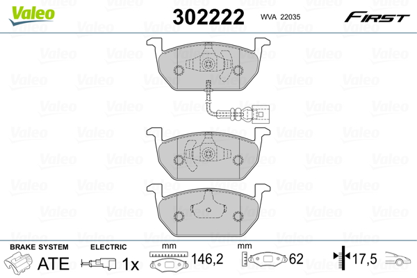 Partea de montare: punte fataSistem de frânare: TEVESLatime [mm]: 146Înaltime [mm]: 62Grosime [mm]: 17,5Latime 2 [mm]: 146Înaltime 2 [mm]: 62Grosime 2 [mm]: 17,2Numar WVA: 22035Contact indicator uzura: inclusiv contact avertizare uzuraNumărul indicatorilor de uzură [per axă]: 1Lungime contact avertizare [mm]: 155Mod de operare: electricArticol completare/Info suplimentar 2: cu tabla anti scartaitAprobare: ECE-R90Greutate [kg]: 1,62